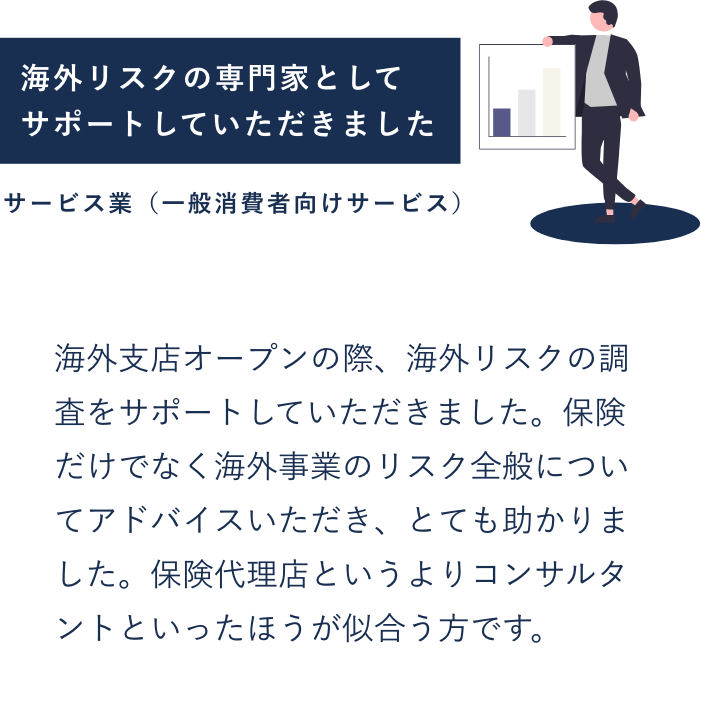 ご安心ください!保険のことはもちろん、昨今の海外事情から海外リスクのことまで、海外経験豊富な代表が丁寧にご説明いたします。まずはお気軽にお問い合わせください。